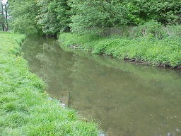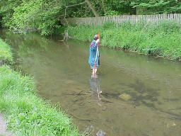 the changes in river characteristics with distance downstream. Depth and width of channel were measured at 24 gauging points taken at regular intervals downstream. Can you see any downstream changes in river characteristics from the photographs? Look for meandering, increasing width and depth of channel. The photographs begin upstream at guaging point 1. At point 12 a tributary joins the main stream. |